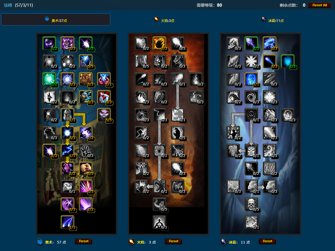 奥法天赋推荐57-3-11的加点方式,冰霜系主要点出冰冷血脉即可,火焰系加3点燃尽即可,这一套可以说是最经典的奥法加点方式,奥法在80级版本主要有两大改动,一个是奥术冲击,由以前的降低施法时间改为了提高伤害,另一个就是多了一个核心天赋,飞弹速射天赋,也就是施展奥术冲击的时候有40%的概率触发飞弹速射,可以让奥术飞弹以极快的方式射出,并且不耗蓝。