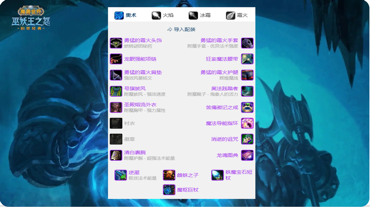 奥法天赋自带6%的命中,所以我们就还需要配置11%的命中才算及格,当然一般团队中都会有鸟德或者暗牧,可以提供3%的命中加成,所以我们配置装备的时候就只需要8%的命中即可,也就是大概210点命中等级。