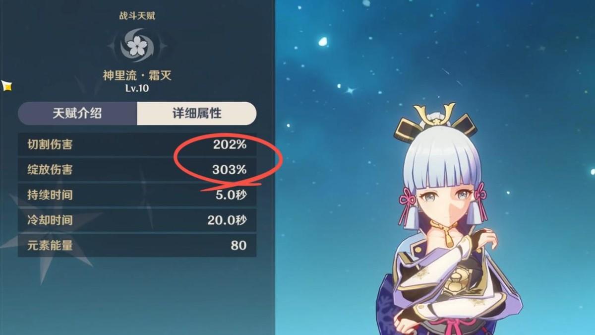 首先,神里绫华是冰系主C,伤害主要来自于直伤,她是不打反应伤害的,队伍主打的是永冻,主要靠的是大招爆发。她的大招有多猛?一张图你就可以看明白,20段的伤害,4000多的倍率。
