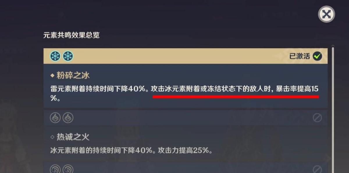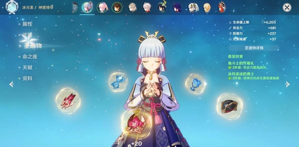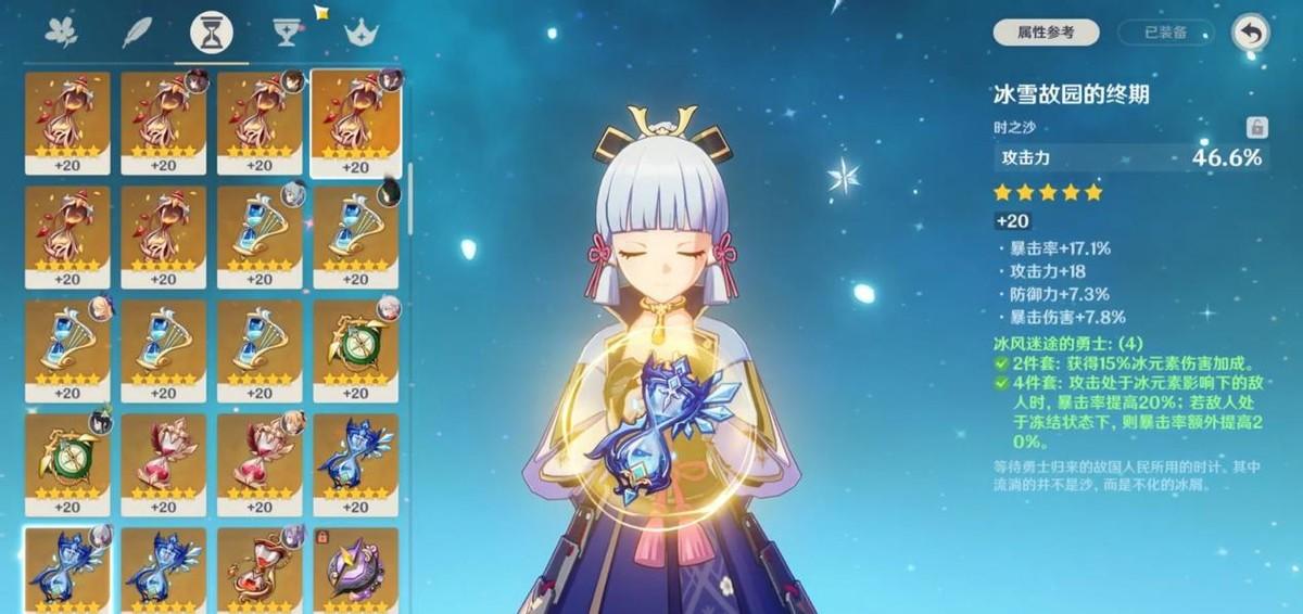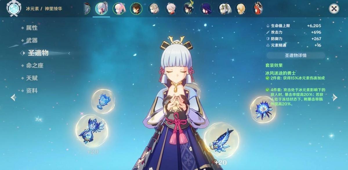 要注意的是,爆伤>暴击>大攻击,神里绫华暴击率不需要堆太高,30%以上就够了。因为四冰套的效果加20%暴击率,冻结再加20%的暴击率,还有双冰共鸣加15%暴击率。所以神里绫华本身就不缺暴击率。