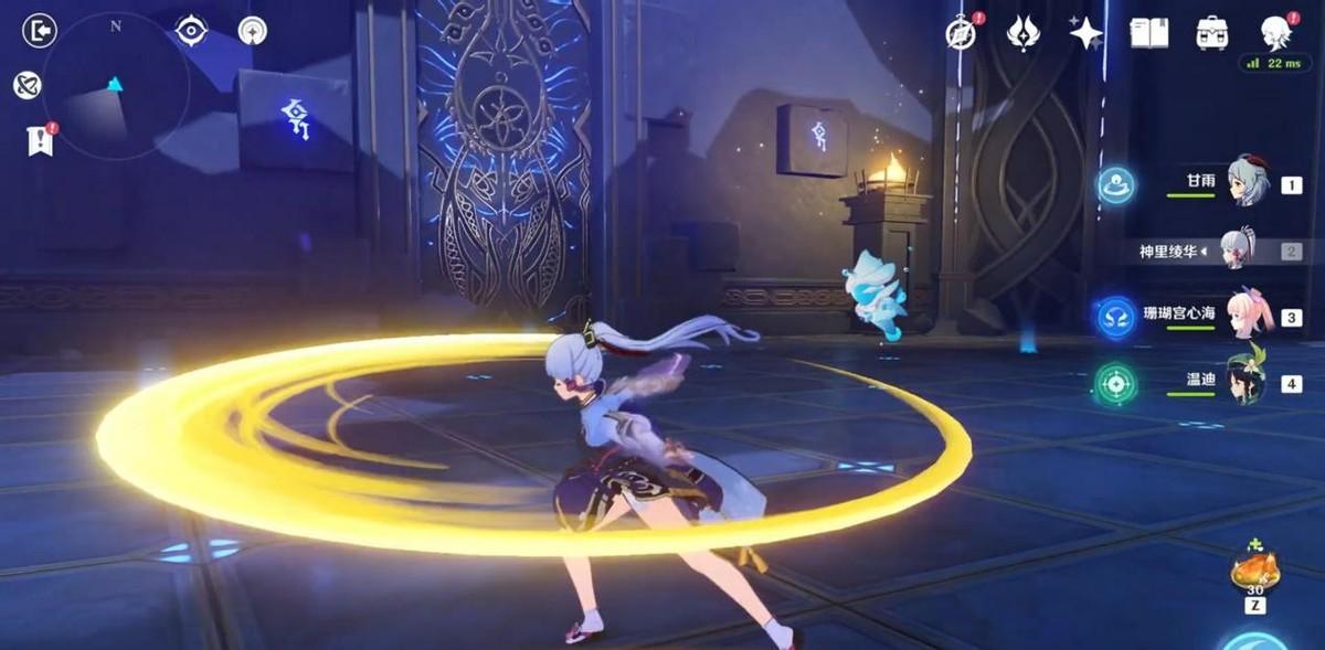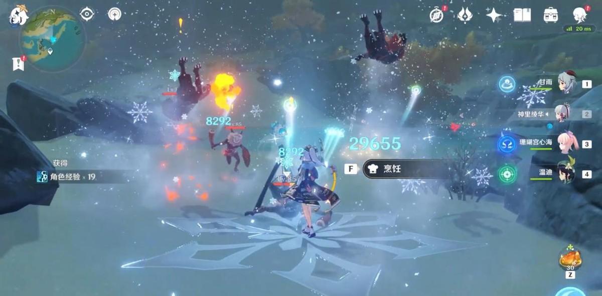 操作手法是冰系辅助挂冰和增伤,风系辅助扩散和聚怪,水系角色挂水,最后神里绫华出来冲刺后平A接QE接四普攻一重击输出。