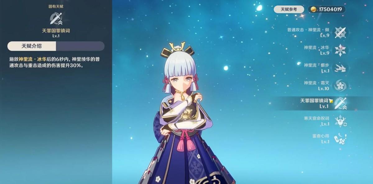 天罪国罪镇词,释放E技能后,神里绫华的普攻和重击伤害提升30%。为了吃满它的天赋效果,天赋的操作手法是先冲刺到怪的周围,如果是雾切,需要平a攒特效,然后释放大招,再是e技能,再四普攻一重击进行输出。