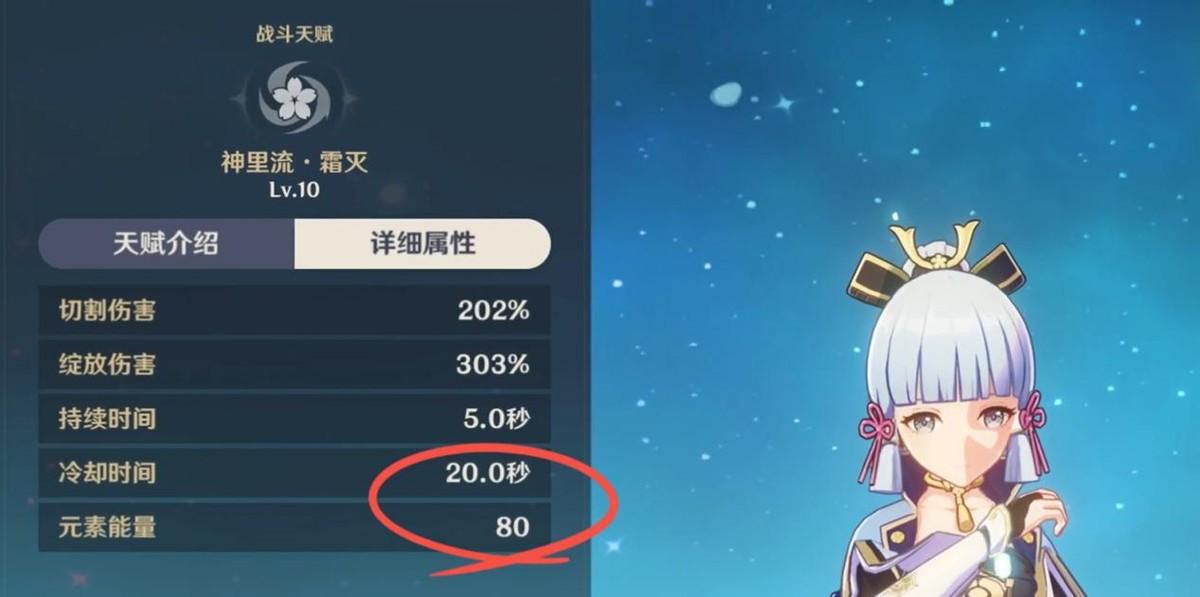 Q技能向前方释放冰风暴,20段伤害,4000多的倍率,但需要消耗80点的元素能量,冷却时间为20 秒,靠E技能是无法保证循环的,需要其他冰系辅助充能。队伍最好先把怪冻住,以免大招丢失伤害。