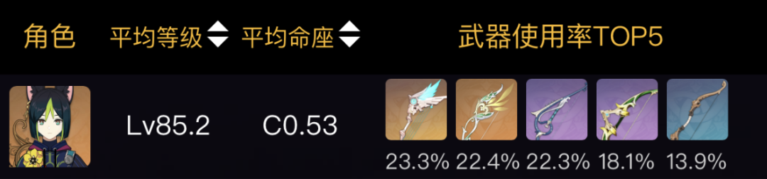 提纳里的专武猎人之径,使用率仅有22.4%,是专武持有率最低的角色之一。实际上提纳里非常吃专武,但专武持有率这么低,完全是是因为提纳里的专武目前仅在3.0版本UP过一次,提纳里进了常驻池,专武却没有进常驻,这也导致不少3.0以后入坑的玩家,歪到提纳里之后,想抽专武都没有机会。