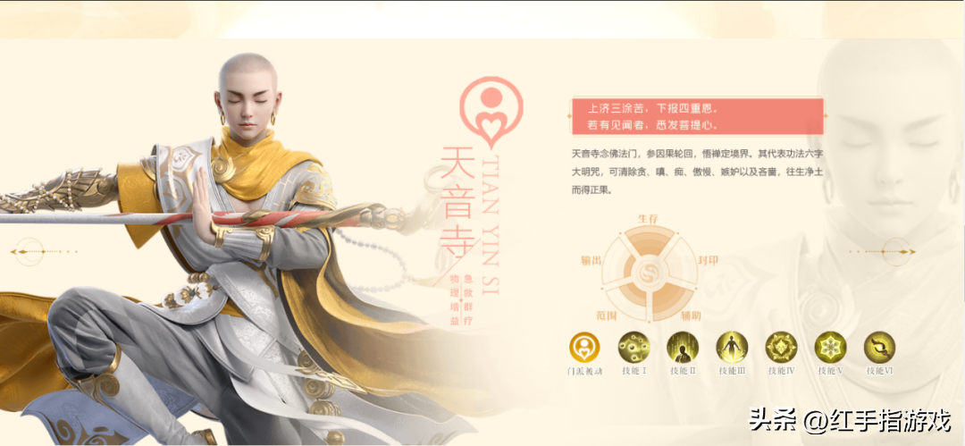 女生首选。会单加血,群加血,点灯加状态复活。作为游戏里的治疗职业,混团好混,永不下岗。抓鬼,战场,封妖都可以,哪里都不能没有天音寺。挂机的话把秒3点出来装备弄好点,秒的也很多,野外队伍也会要,55以上剧情任务没医生就别想过。