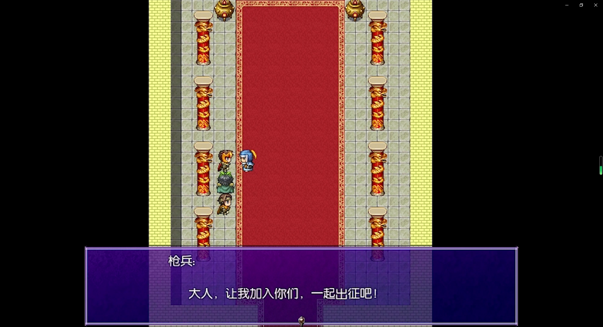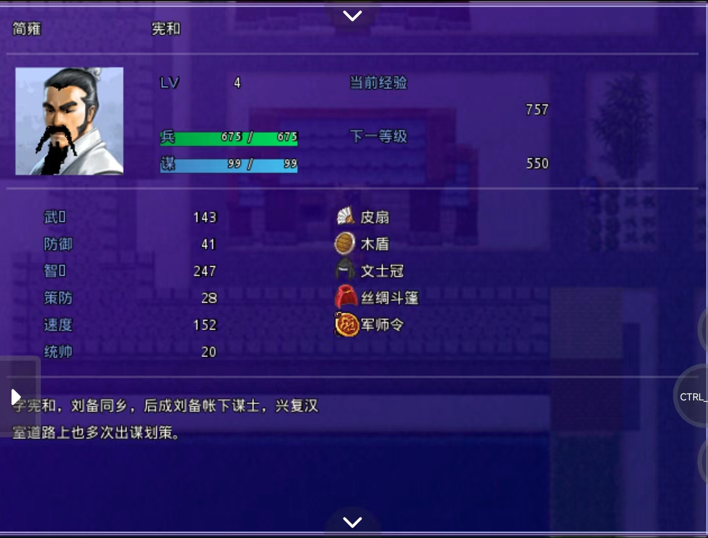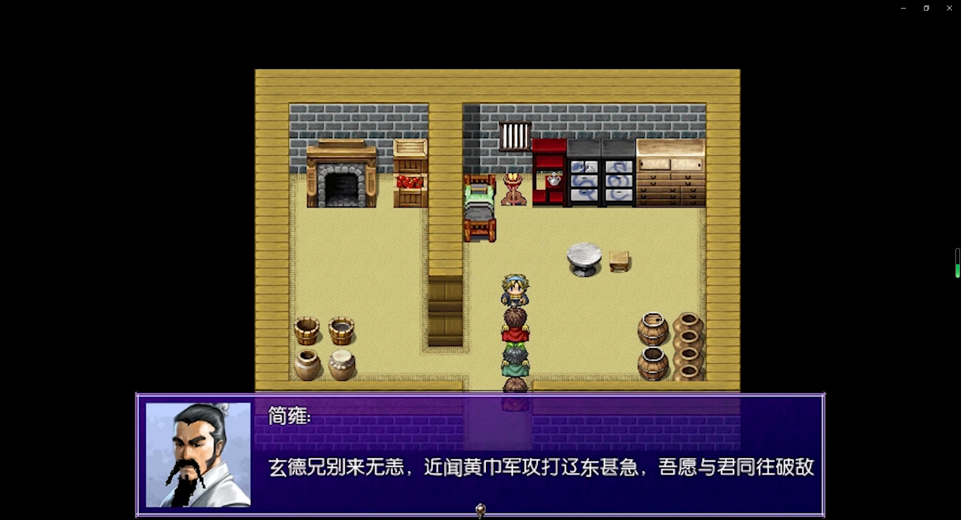 村中有个游侠,说村子里边有个贤士要加入我们,在最下边的民房里边对话,发现是简雍。简雍智力水平相比原版有提升,前期会优先学会业火技,搭配军师令牌,一下能打2500多血,前期相当厉害人物。