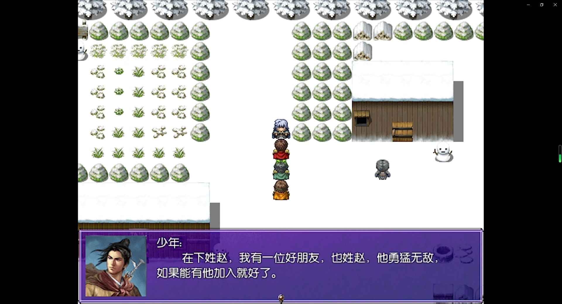 老规矩,我们在雪屋搜索一番,有万能药、解毒草,在民房对话少女,得知黄巾在山洞里边。门口少年告诉我们有个姓赵的朋友,勇猛无敌,生怕我们不知道是赵云。