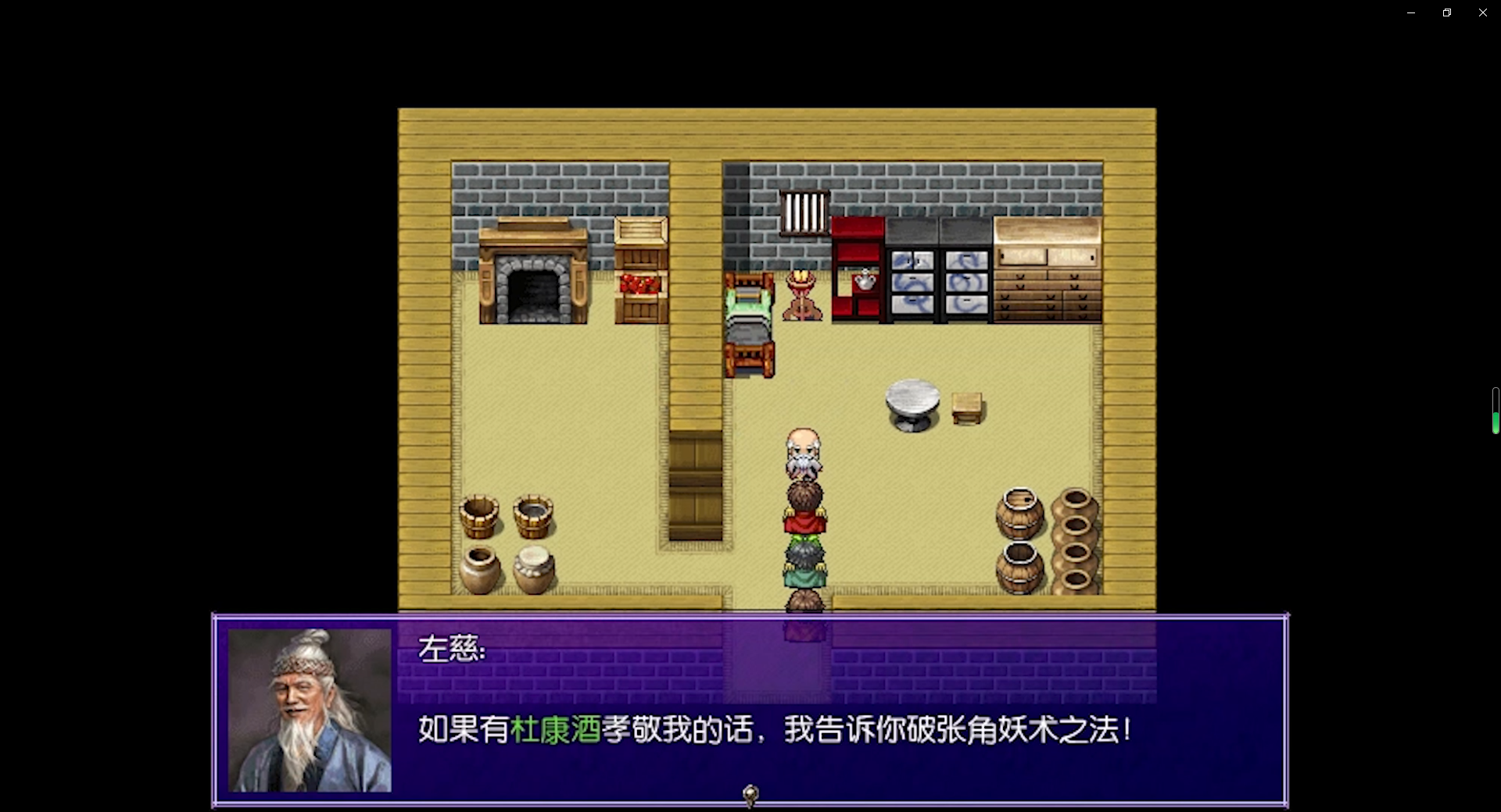 打完程远志之后,继续回到幽州城下边的关卡,张角使用妖术,我们无法通过,然后回到幽州,在左下角房间找到左慈,左慈要求我们给杜康酒才能给线索,然后出门往辽城,对话酒鬼,去酒屋买酒(真的是贵的一匹,1000大洋就没了)。送酒回来之后,左慈给太平符,这下可以打张角了。