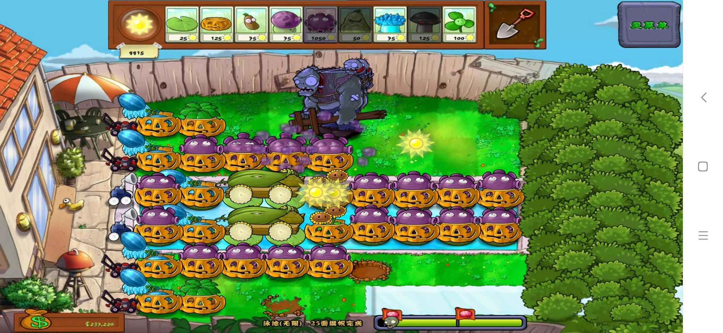 上面阵型,冰瓜、玉米加农炮阵型最好不要变化,我看有其他攻略讲泳池五六排也种玉米加农炮,我试了,很容易被吃掉,吃掉多了阵型就不好补了,所以我直接换成了可以戴南瓜套的植物。