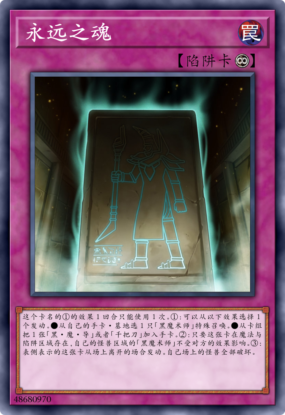 【永远之魂】这张卡是这个战术的核心。1效果可以从手牌和墓地特殊召唤黑魔导,是黑魔导卡组能够滚雪球越大越强的重要保证。2效果则是可以让场上的黑魔导不受对方效果影响,这个效果能够给让场上的黑魔导免疫大部分魔陷和怪兽效果,比如【黑洞】【雷击】之类。3效果则是一个负面效果,一旦自己被破坏,那么自己场上所有的怪兽都将会被破坏。这张卡的前两个效果都非常强势,所以需要格外注意规避掉3的负面效果,也就是讲究一个扬长避短。