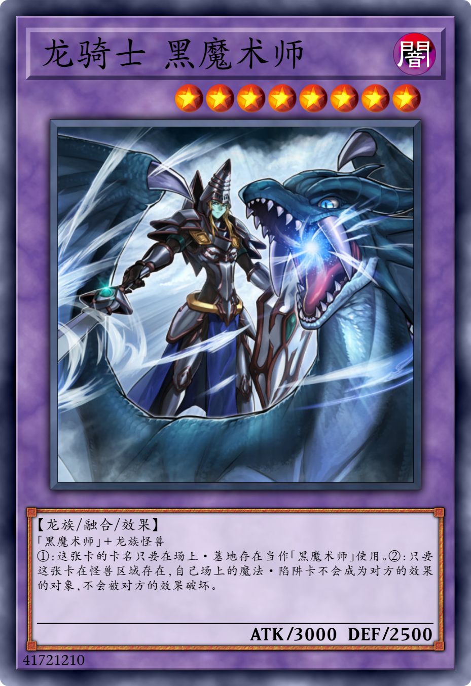 【龙骑士 黑魔术师】原作中是黑魔导与传说之龙蒂迈欧融合而成的龙骑士马甲,实卡化之后的融合素材变得更为宽泛,只需要1只黑魔术师和1只龙族怪兽就行。这张卡配合永远之魂主要是在2效果:当这张卡在场上的时候,自己魔陷区的卡不会成为效果对象,也不会被效果破坏。有了这张卡的保驾护航,对方基本上无法解掉我方后场的永远之魂。