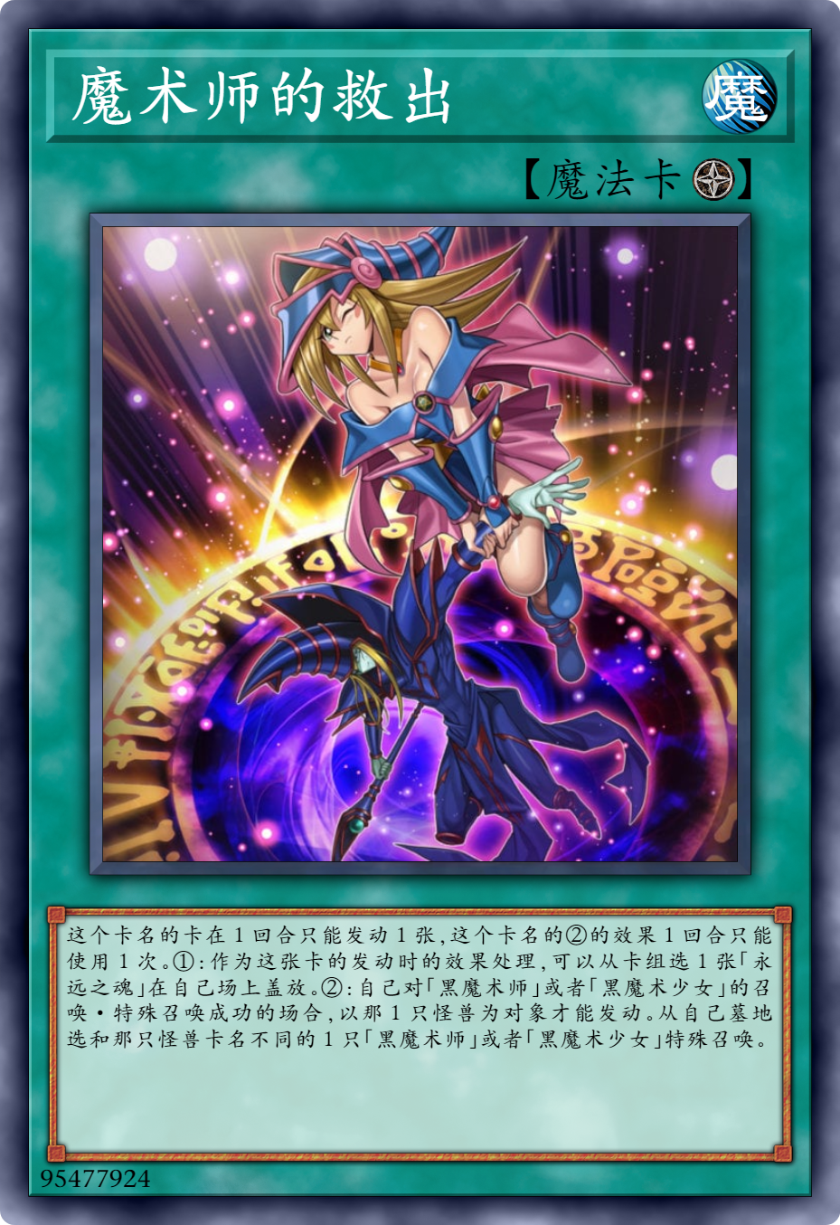【魔术师的救出】永远之魂可以用这张场地魔法卡从卡组里面直接检索。得益于这些年K社出了不少黑魔导的补强卡的缘故,除了这张魔术师的救出,卡池里面还有像【黑魔导阵】和【魂之仆人】,以及【魔术师之杖】等等黑魔导专用的检索卡,基本上可以保证永远之魂的上手。所以余下的关键在于如何快速的召唤出龙骑士黑魔导。