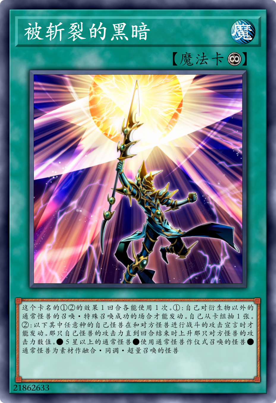 【被斩裂的黑暗】在场上集齐了永远之魂和龙骑士黑魔导之后,对面玩家想要破局就只有先解决龙骑士黑魔导。但是龙骑士黑魔导因为永远之魂的效果,不受其他卡牌的效果影响,所以对方玩家要想解决龙骑士黑魔导,除了用海龟规则吃掉龙骑士黑魔导之外,就只能通过正面攻击。然而这张被斩裂的黑暗也彻底杜绝龙骑士黑魔导被战斗破坏的可能,因为这张卡的2效果会让龙骑士黑魔导在战斗的时候,攻击力上升对方怪兽的攻击力值,永远比对方高3000点。总之只要这三张卡同时存在场上,两个字就是:无敌!