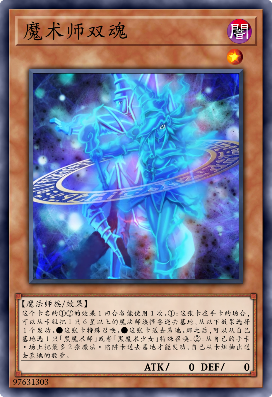 【魔术师双魂】也可以通过这张魔术师的双魂,直接从卡组将1张黑魔导送入墓地,然后将其特殊召唤到场上来。之后再借助传说之龙【提迈欧】的力量,直接将场上的黑魔导变成龙骑士黑魔导。这样需要集齐的关键卡就只需要永远之魂、魔术师双魂、提迈欧之眼3张卡牌。