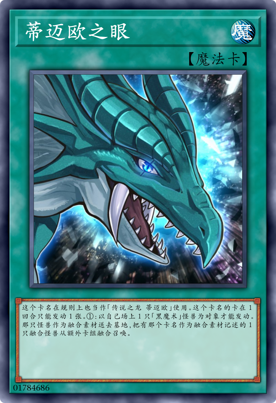 【蒂迈欧之眼】这张卡能够只用1张黑魔导当融合素材进行融合召唤。只要是卡牌上记叙了【黑魔导】之名的融合怪兽,都可以直接从额外卡组特殊召唤上场。原作中龙骑士黑魔导也就是黑魔导利用蒂迈欧的力量成为龙骑士的。这张卡的缺点在于难以检索,虽然投入这张卡可以让需要集齐的关键卡减少为3张,但是考虑到卡牌的检索效果,其实实战中的达成率跟用【黑魔术的秘仪】手融也差不了多少。