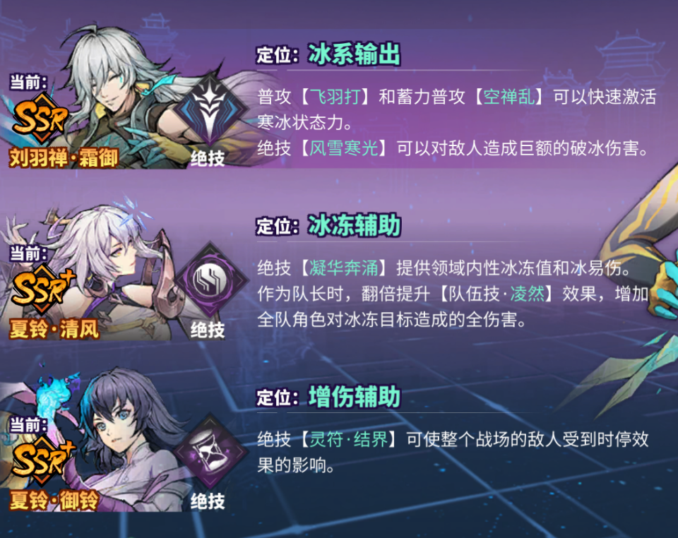 那么这个打法的核心就是利用不断使用和切换刘羽禅、夏玲·清风两位角色来快速打出敌方的冰冻状态,接着再用刘羽禅的援助技、蓄力攻击和大招来激活破冰伤害。