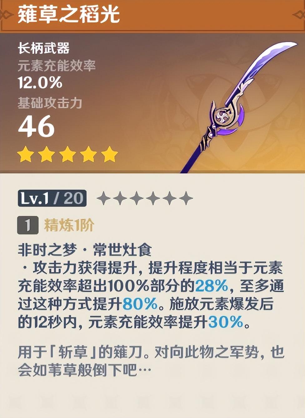 薙草之稻光,雷电将军的专武。这把武器能够让以元素爆发为主要输出的角色的输出能力能够与其元素充能效率相得益彰。