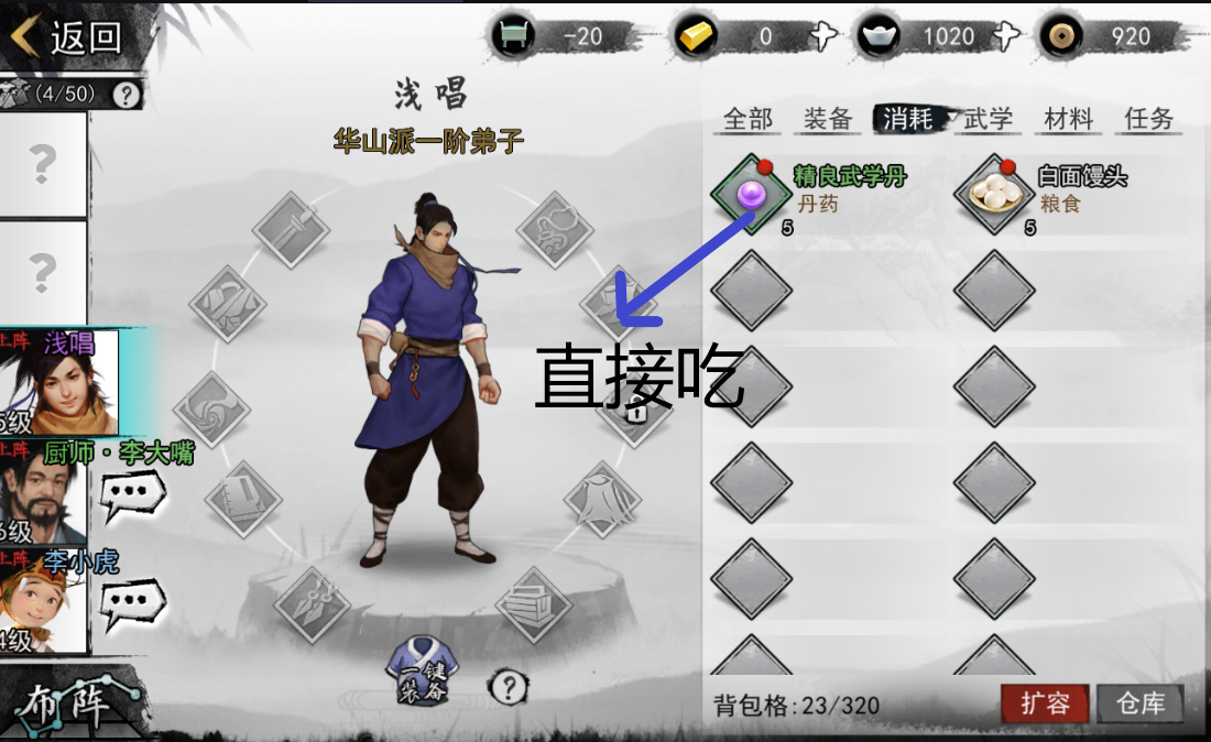 根据任务提示,主线做到拜师,接取师门各种任务,招募到师门内的本门角色。(因为师门任务可获得较多的本门派武学残章,本门角色的实力上限会比其他门派的角色更高)主角15级前,可以免费忘记已学会的武功,月牙村时通过各种方法乱学武功不怕,但是一定要在15级前忘记,通过师门的师傅挑选自己顺眼的一套武功学习,低品质武功对同套路的高品质武功都有加成,一般也是组合技和秘奥义的必备武功。武功学会以后,不要吝啬背包里的武学丹、经验丹,直接吃。然后不要急着出师,招募师门队友上阵后,就去练级。