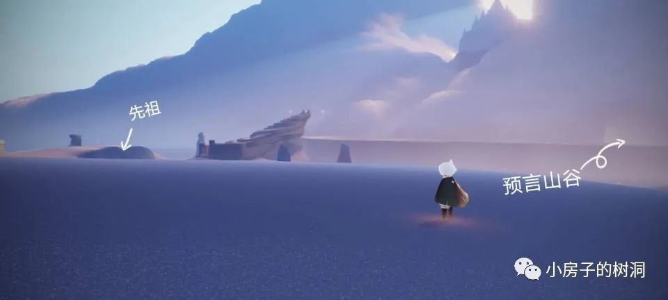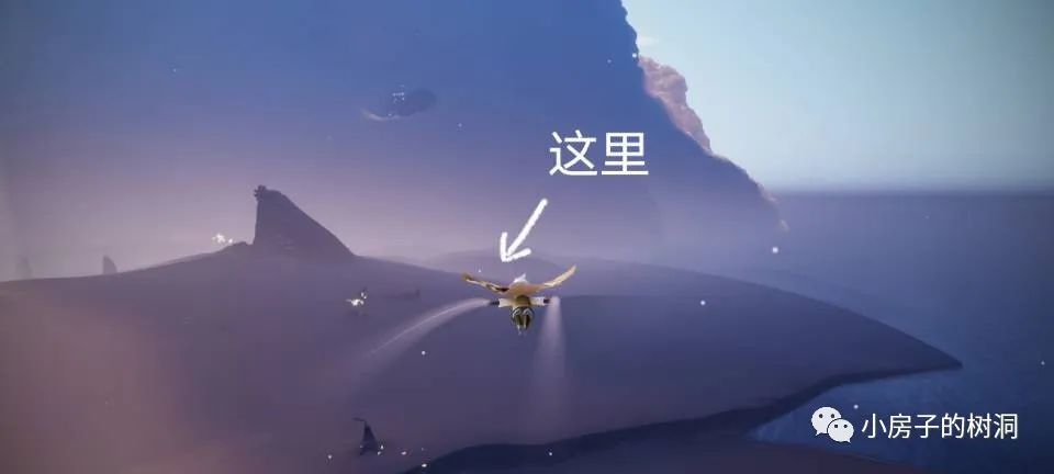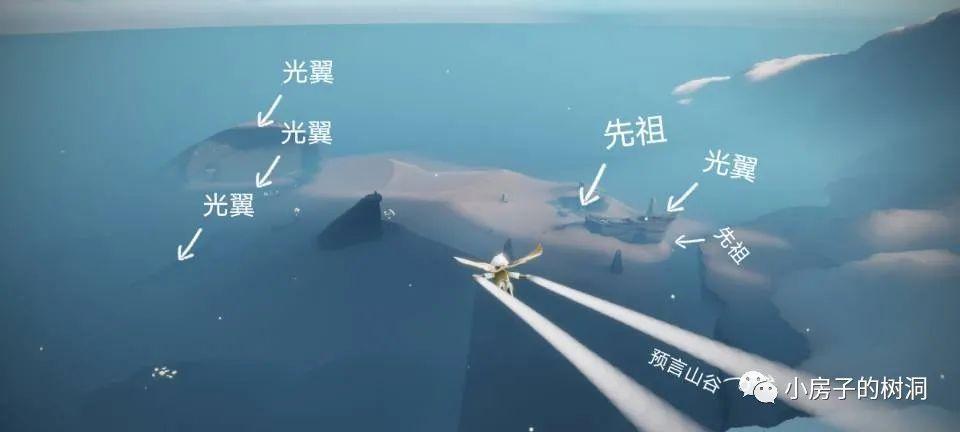 “从顶部飞去就可以直接落在预言山谷的入口,从入口进去到达门口,在山谷里边有四个试炼(后期会根据大家需要出教程的)终点有光翼,四个地图四个光翼,试炼里边也有蜡烛,蜡烛会每天更新,光翼不会,所以其实晨岛准确来说应该有9个光翼。