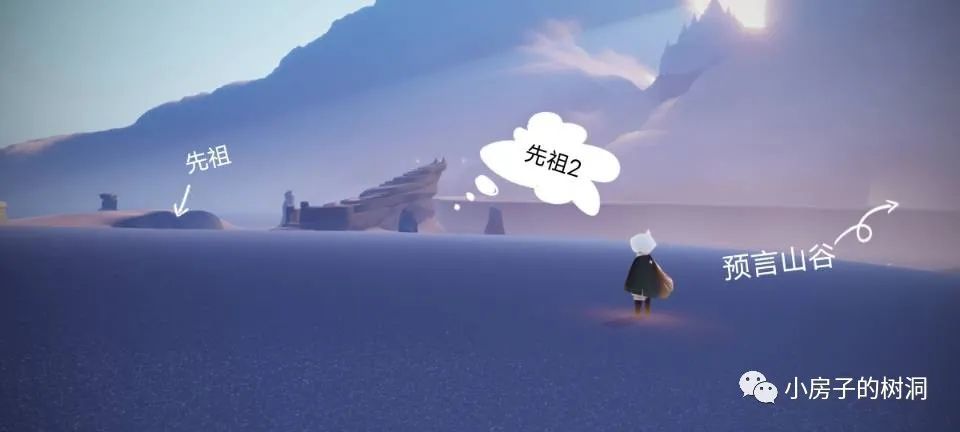 如图所示,第一个先祖,进入地图后往如图3所示方向走即可看到图2的标志性景物,注意,晨岛有两个大石头,一个是图3的一个是图2的,图3是不能飞上去的哦,只能看看。