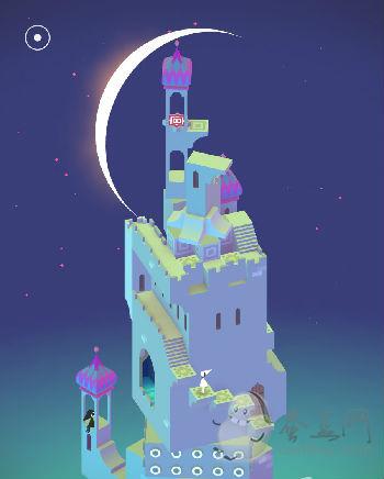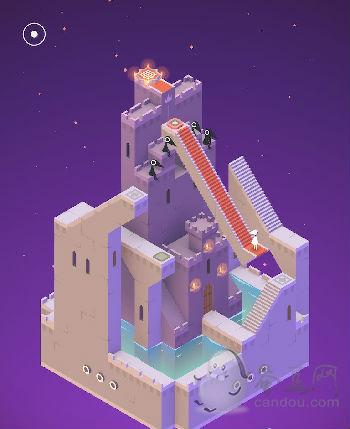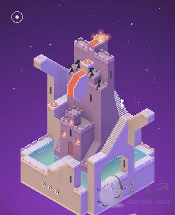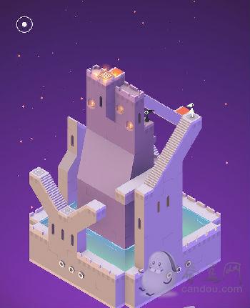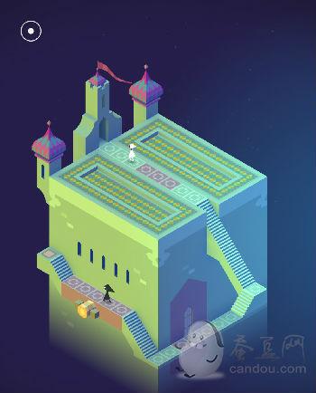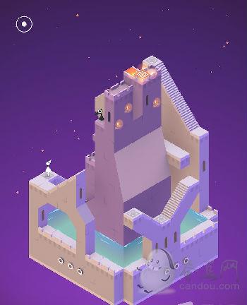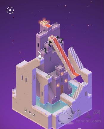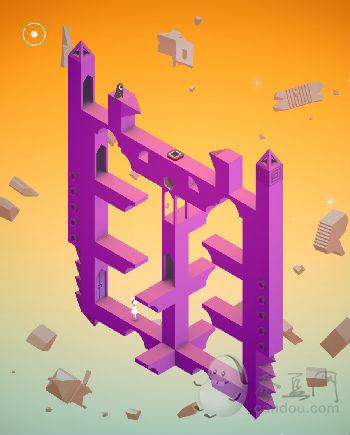 在出现的黑色场景中与蓝色精灵互动(几何神功,难道和如来神掌一样?吐槽不能)。直接走入洞口,出现在紫色城堡处。这里常需要各种旋转。首先让艾达走到制高点。