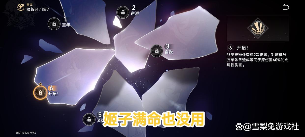 不得不说姬子这个角色才是“五星之耻”,作为列车上最有权势的人,输出能力竟然那么低?虽然五官精致,建模完美,不过战斗力真的战五渣。