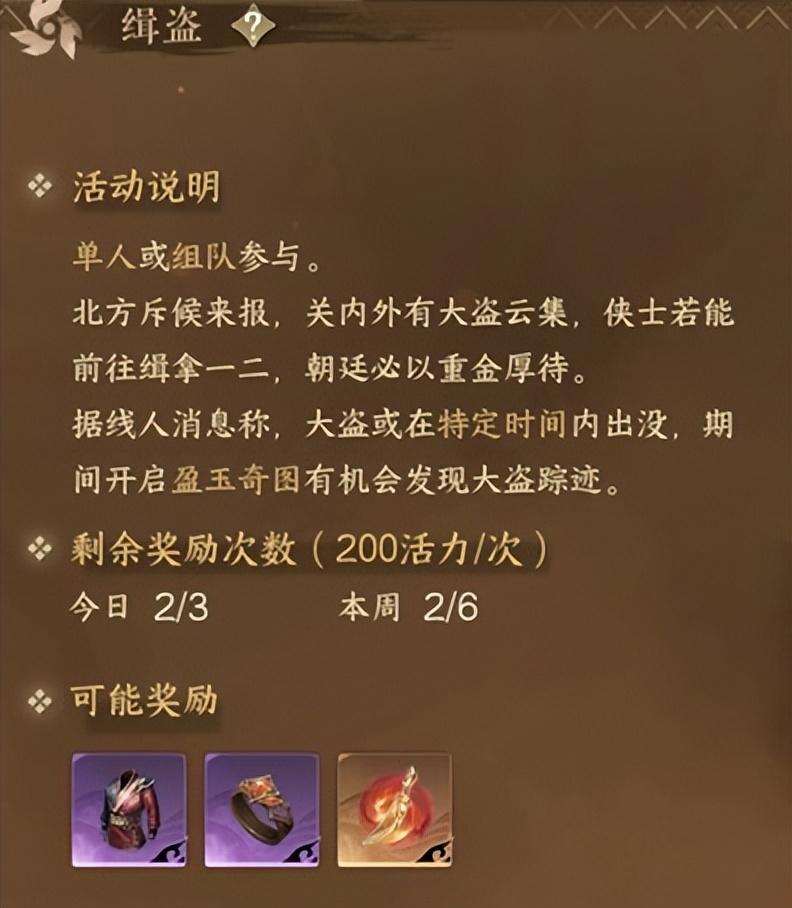 据线人消息称,大盗或在特定时间内出没,期间开启盈玉奇图有机会发现大盗踪迹;