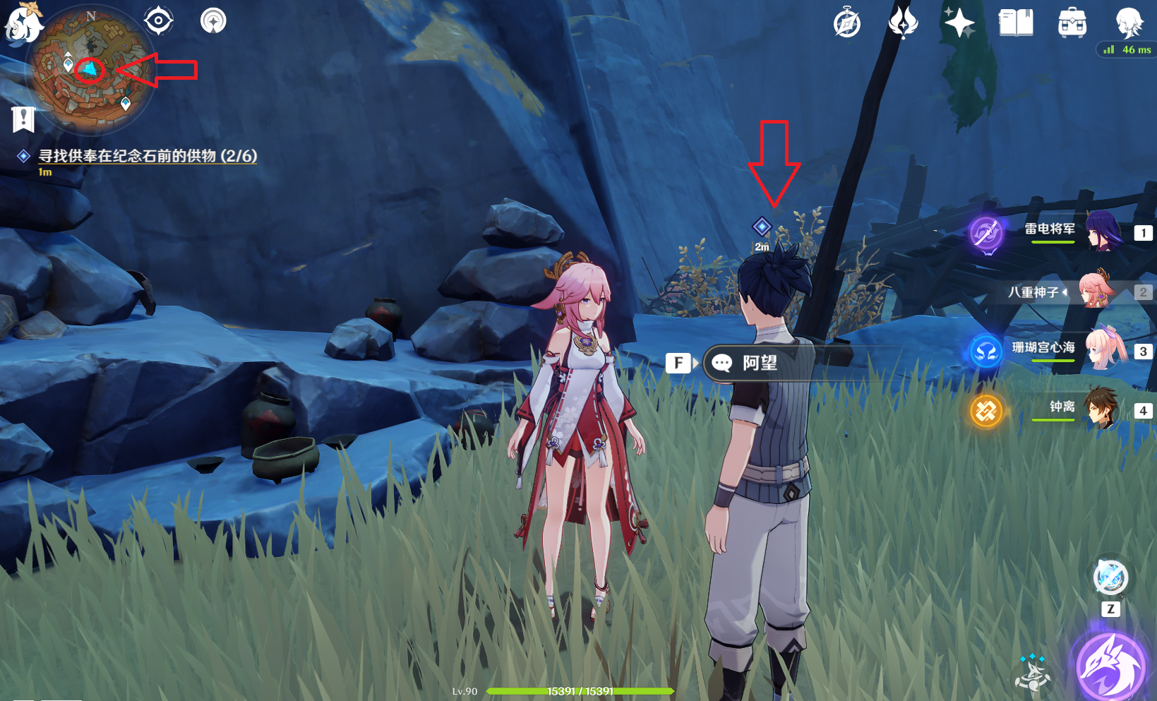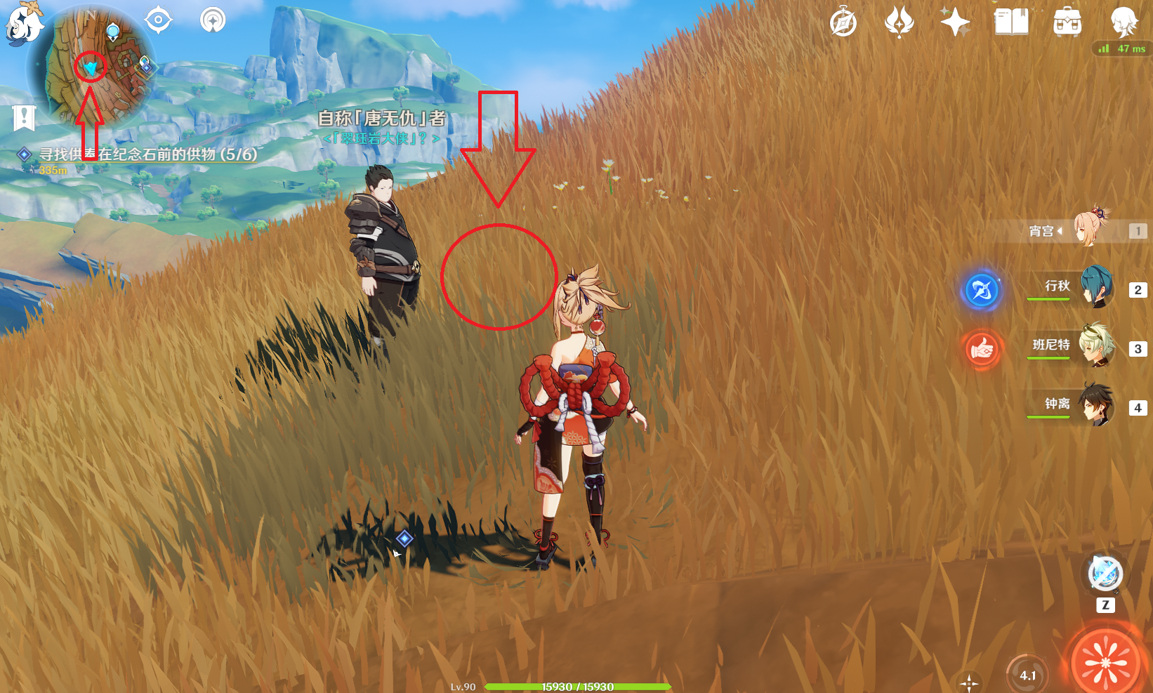 千年千岩任务接取是在巨渊之口传送点旁边,找到图中这个叫阿望的家伙,和他对话就能触发任务,让旅行者去6个不同的地方寻找6件供奉在纪念石前的供奉物品。这6件供奉物品分别是共饮之杯、岁时之冕、高翔之翎、远眺之花、庇佑之冠和同泽之枪,其实就是5件圣遗物和1件武器。在对话过程中,会有动画显示出这6件供奉物品所在的大致位置,我们按照位置去找就行了。