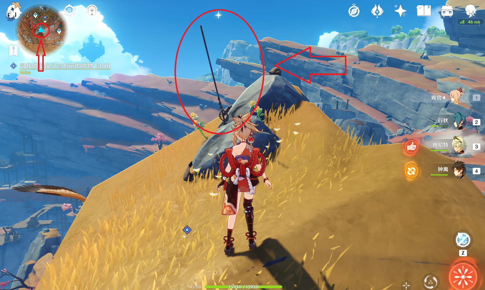 第三件供物,高翔之翎。这件供物的位置,在琉璃峰的最高处,也就是突出来的那一部分岩石的上面(有一根很高的直立木桩,可以作为参照物)。传送点我们选择天工峡的那一个,虽然在距离上确实是更远了一点,但爬山的困难程度要远远低于琉璃峰右侧的传送点。到达琉璃峰最高处之后,这里有一个鸟窝,调查一下就能获取高翔之翎了。