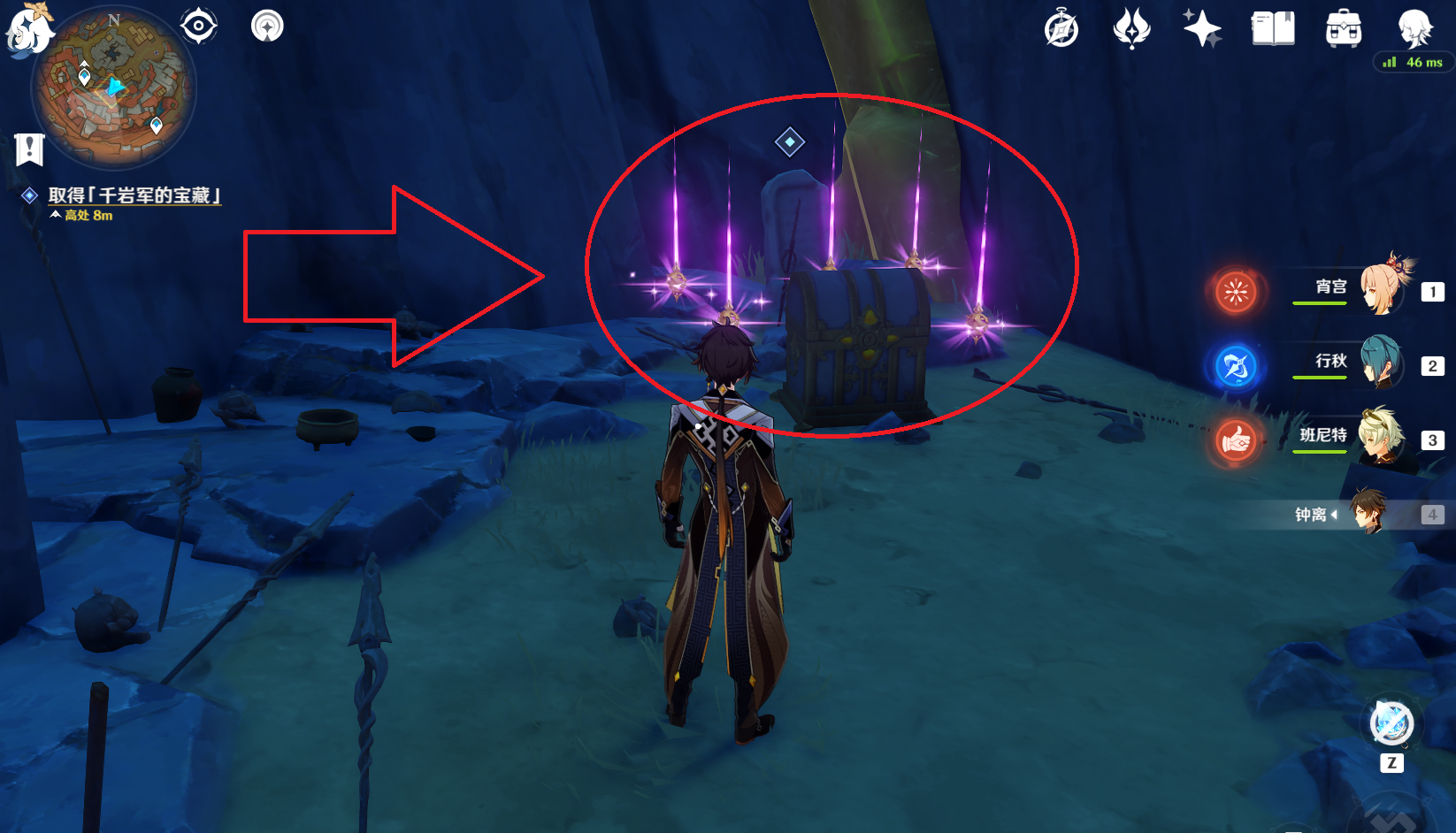 第二件供物,岁时之冕。这件供物因为在地面,也是可以在跑图的过程中完成的,位于地面矿区右边的传送点附近。参照物是几块大型的岩元素共鸣镇石,如果实在找不到位置,就记住在传送点的左上方一段距离就行。供奉物就放在上图中的桌子上面,并且由一个盗宝团成员看守着,我们击败盗宝团成员之后,就可以调查桌子拿到岁时之冕。
