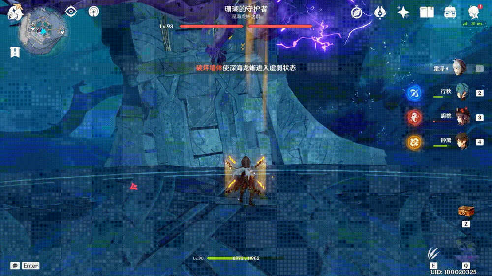 3.组合技能结束,其中一只龙蜥会跳到墙上。此时去打跳到墙上的那只龙蜥,敲碎那面墙即可获得成就,使用大剑角色或者钟离可快速破墙。