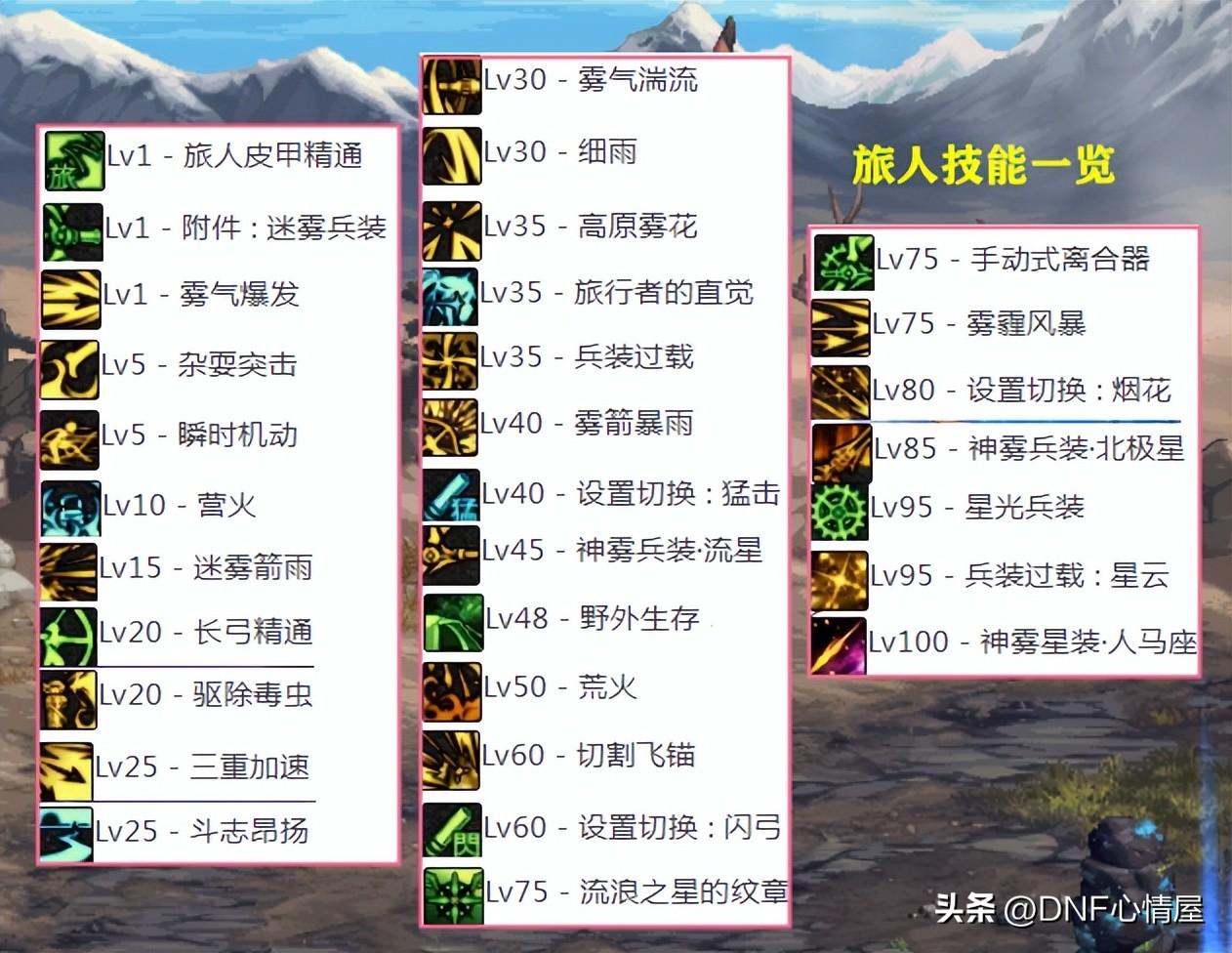 旅人15级技能“迷雾箭雨”,这是必满技能,位移类型小技能,只需要学1级即可。20级“长弓精通”,这个被动技能,也是必满,能增加物理攻击力和命中率。