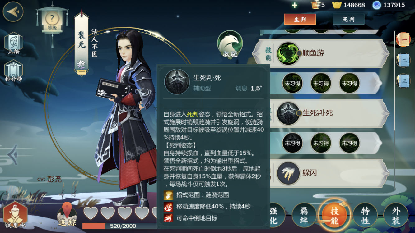 生死判:该技能的秘籍要根据玩家自身的技术进行选择,如果操作有信心,觉得自己可以在死判姿态打出大量输出的话可以选择残页,令其转变姿态后可以输出吸血。如果信心不大的话,建议选择断篇,让自己获得减伤。
