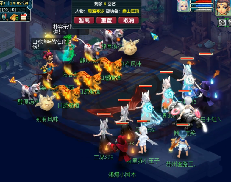 建议:封印梅子汤,优先击杀酱爆鸡丁。因为这两种怪的攻击目标,为玩家携带的召唤兽。当然了,如果携带的是血攻宠的话,那就不用在意击杀顺序了。