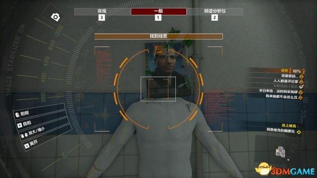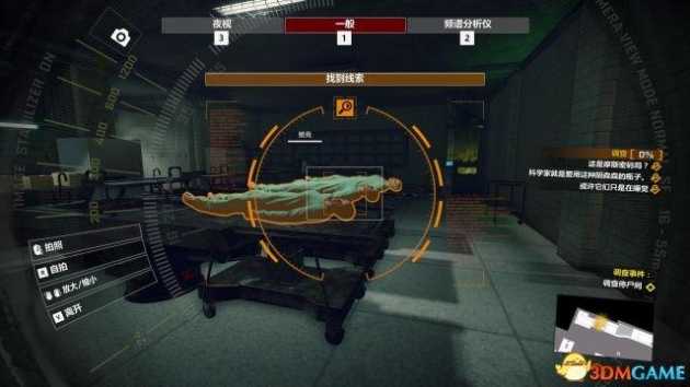 对手术台上的三具尸体(或许它们只是在睡觉)、墙角的显示屏(这是摩斯密码吗?)、用照相机频谱分析仪对墙角的容器(阴森森的瓶子)进行拍照。