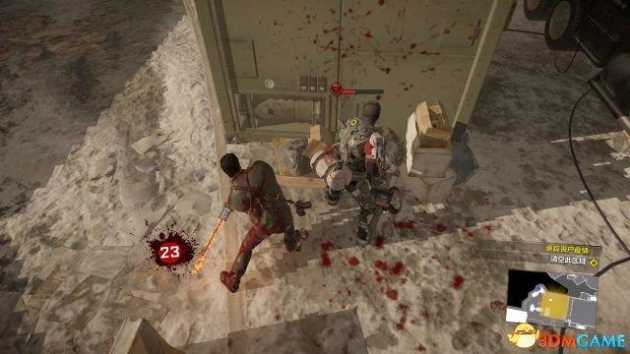 step14.弗兰克终于来到了前门,首先要击退四名暗卫军士兵,接着直升机会将一名持旋转机枪的敌人送到大卡车附近,弗兰克预先埋伏于此,当机枪兵出现后,就猛攻他背后的罐子,当罐子泄露气体,之后就会爆炸秒杀机枪兵。