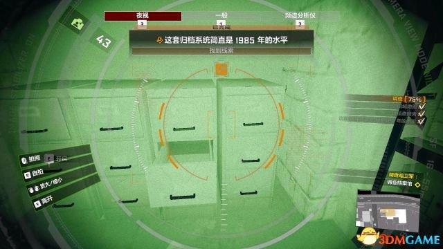 弗兰克需要用相机调查军用手提电脑(未解锁的计算机)、被飞镖扎的弗兰克照片(人人都是评论家)、门口右侧柜子上的资料(需要密码)、用频谱分析仪观察版本(有模有样的密码)、日历,然后再次调查军用手提电脑。