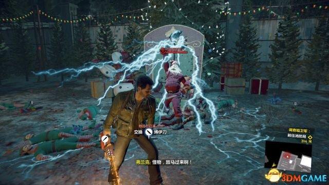 首先要面对三批从礼物包内冲出来的小孩,最后就要面对残酷圣诞老人,他手里拿着的是雷斧,其重击攻击范围非常大,所以最好用枪械远距离对付他。