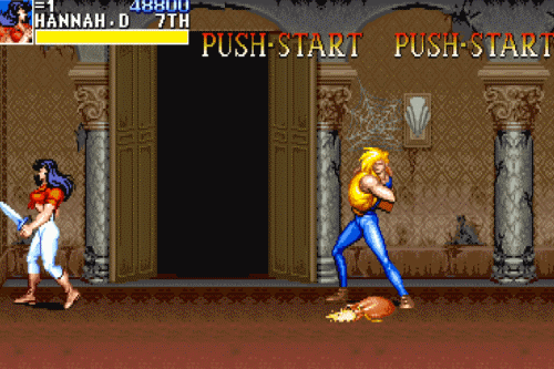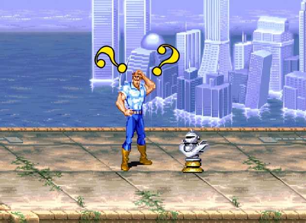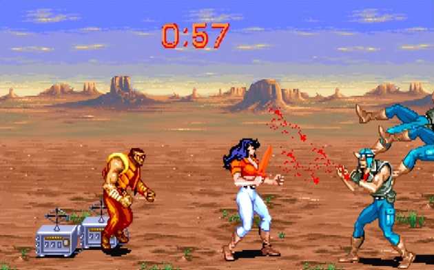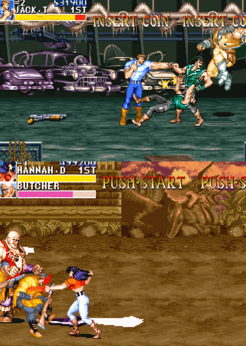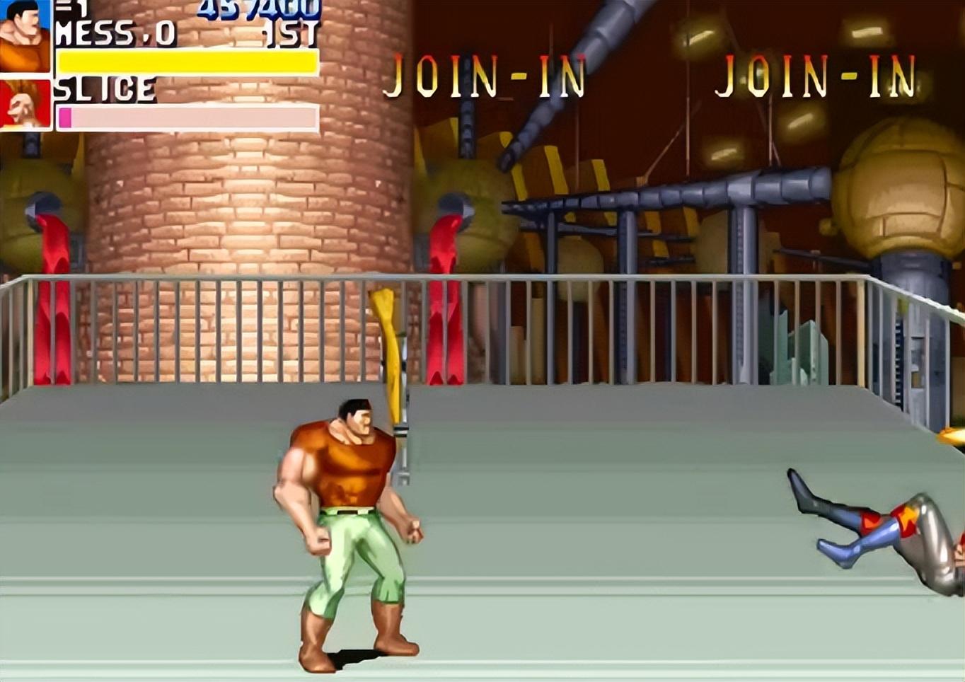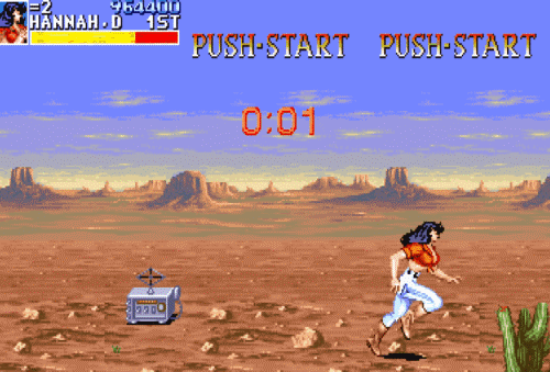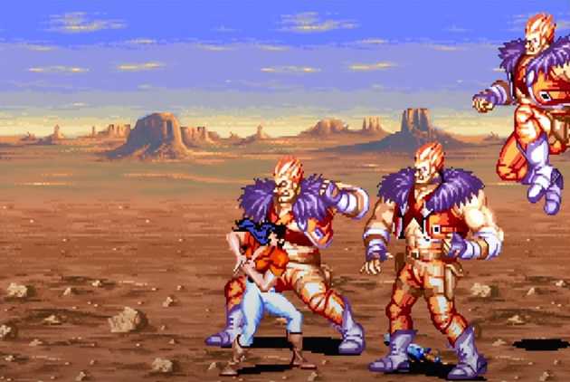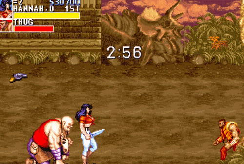 这个秘技最早被发现是在第三关死亡沙漠。这一关论难度也许是《恐龙快打》所有关卡中最棘手的,不仅有着超长路程,沿途还会刷出各种不合理的杂兵阵容,其中最恐怖的是同屏出现三个大壮,一连串又快又狠的组合拳能把你打到怀疑人生。