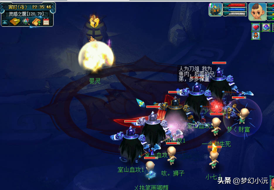 两个队伍都变身后,组队前往(20,30)分别触摸灵灯,触摸后灵感大王出现。然后战斗。