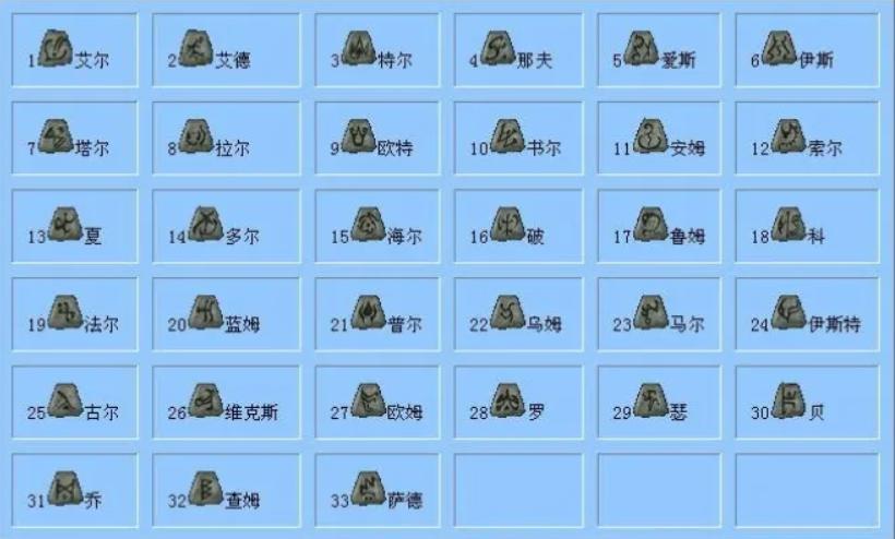 提到符文之语系统,我们首先要知道符文是什么。相信不少玩家在在游玩的过程中,或许是踢开了路边的一个罐子,或许是打死了一个BOSS,或许是抽死了一只小怪,都有可能会拾取到一种金色名字的符文,而这些符文则有着自己的名字,例如“艾尔”、“艾德”、“特尔”等,其功能跟日常掉落的宝石一样,上边会显示镶嵌入不同装备的效果。由于这些名字千奇百怪,所以我们通常采用编号的方式来称呼符文。例如“艾尔”,我们则对应下表称呼它为1号符文,“艾德”则为2号符文,以此类推。由于游戏中并未对此类符文进行编号,因此如果想知道自己拾取的符文是几号,通常需要查阅下表,或者是用一些mod来确定他的序号。