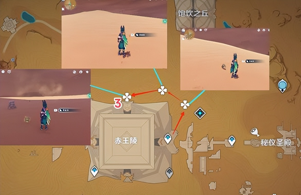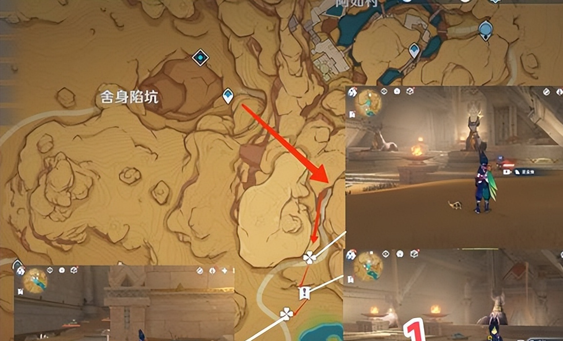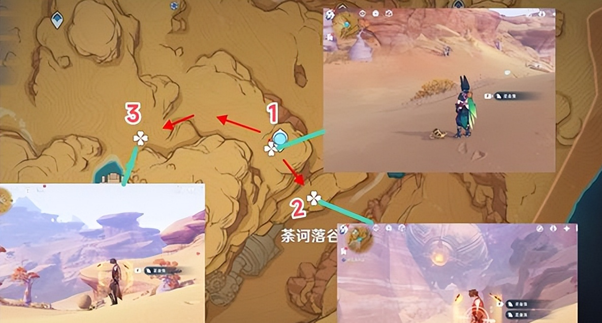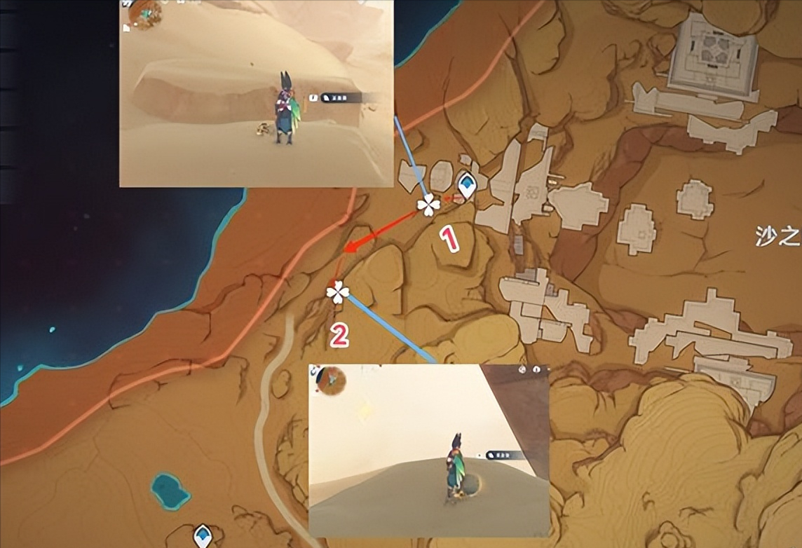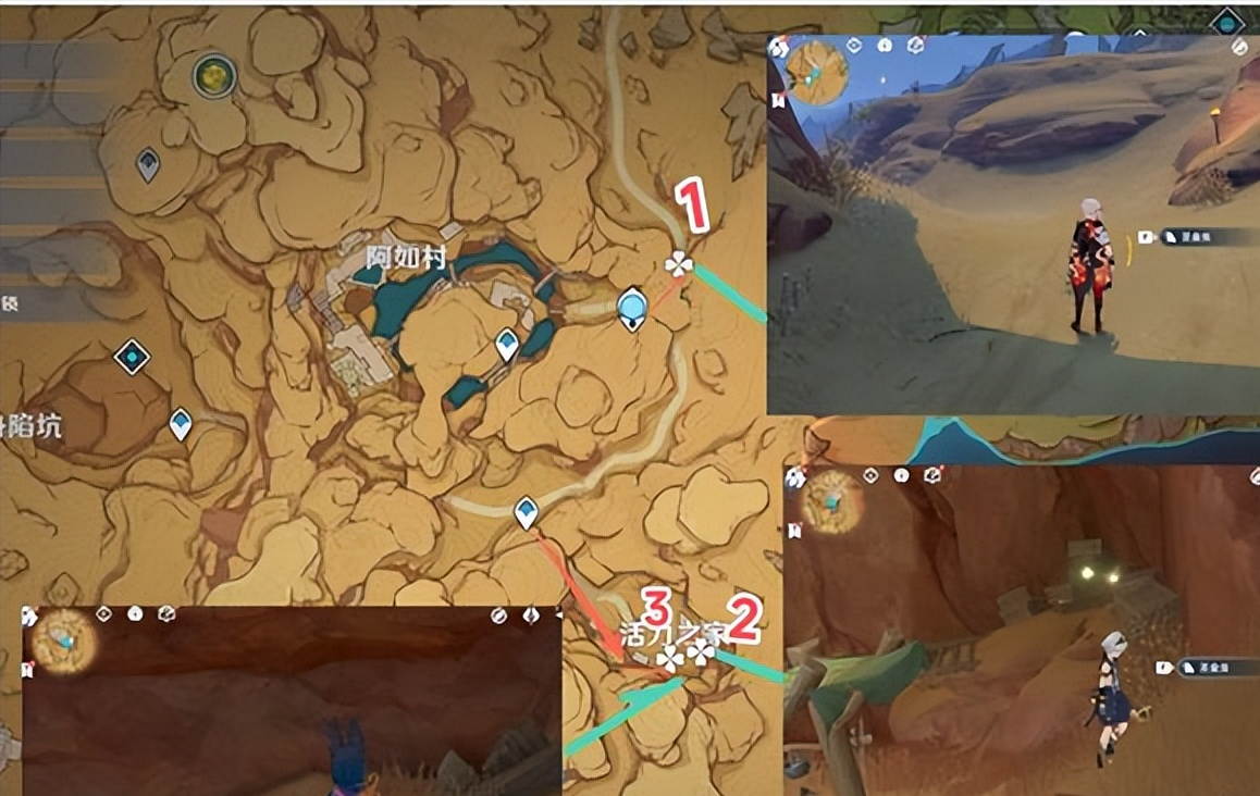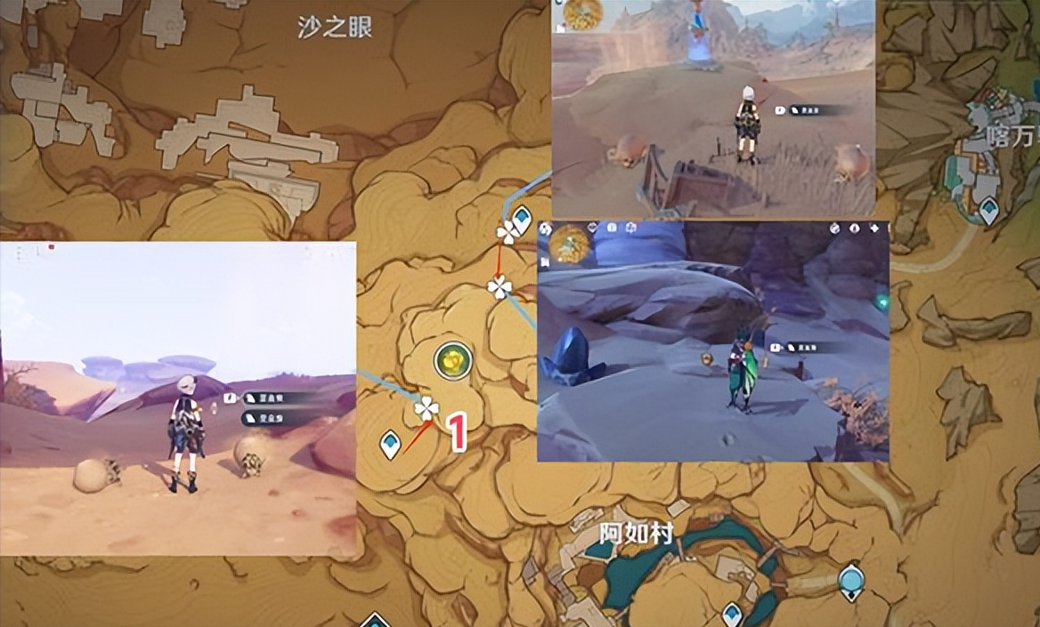 1号标记图处圣金虫在沙堆里,需要用到风元素角色,将沙堆吹走后便会出现圣金虫;