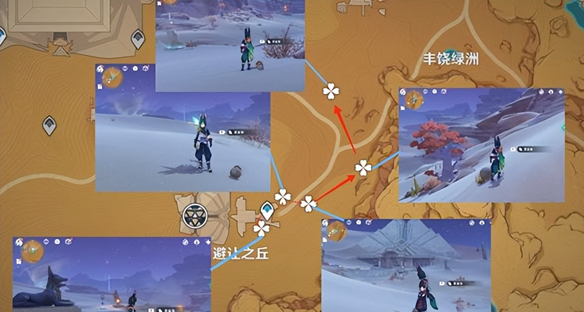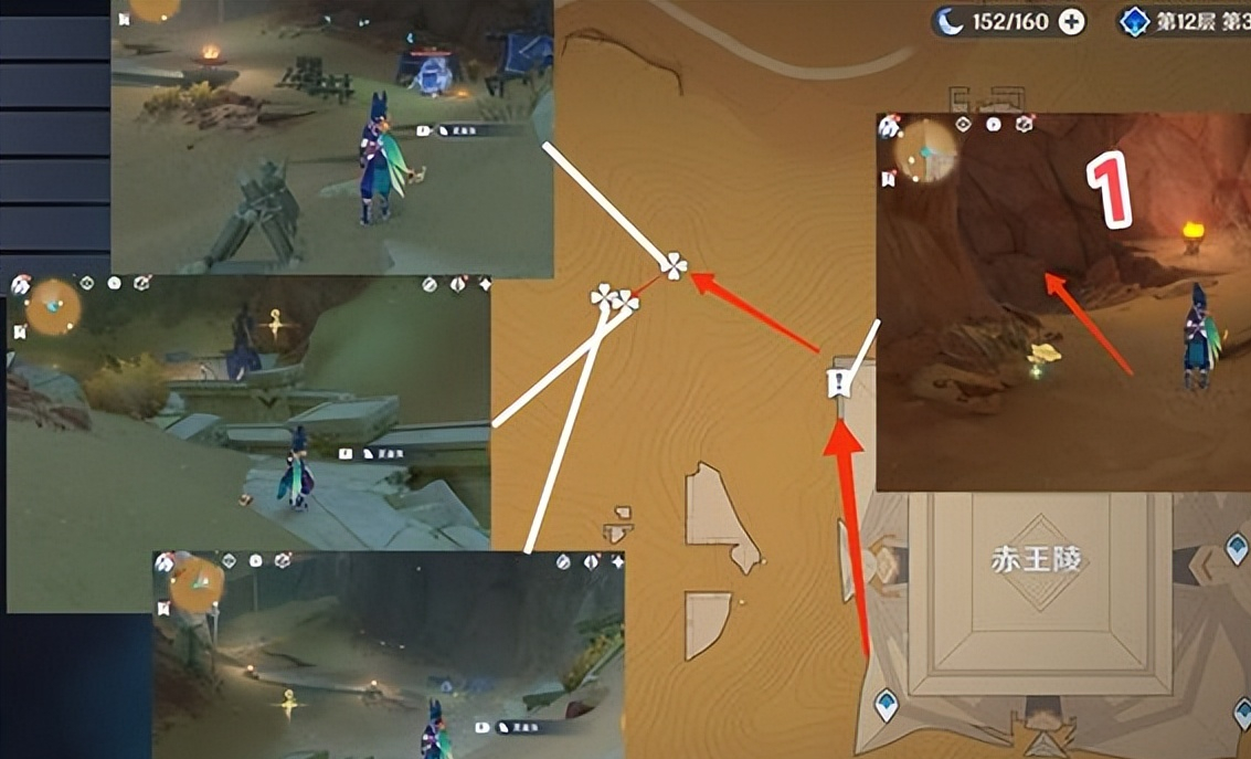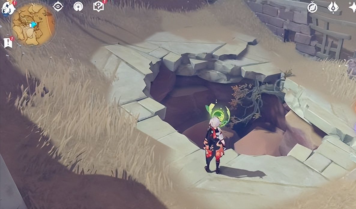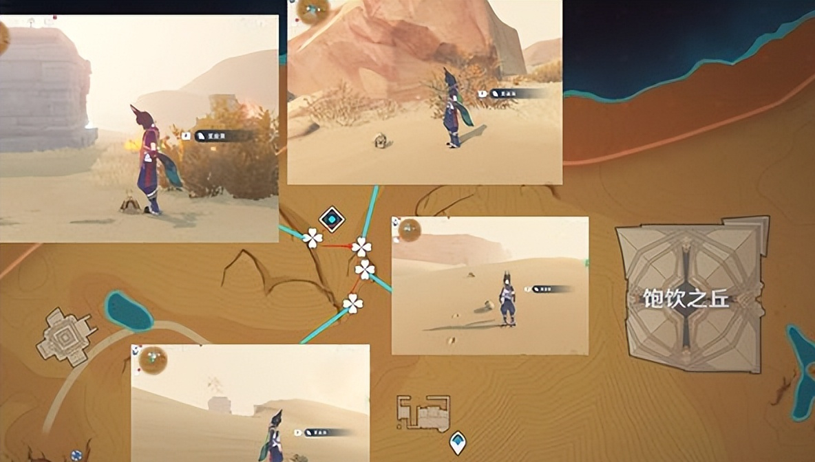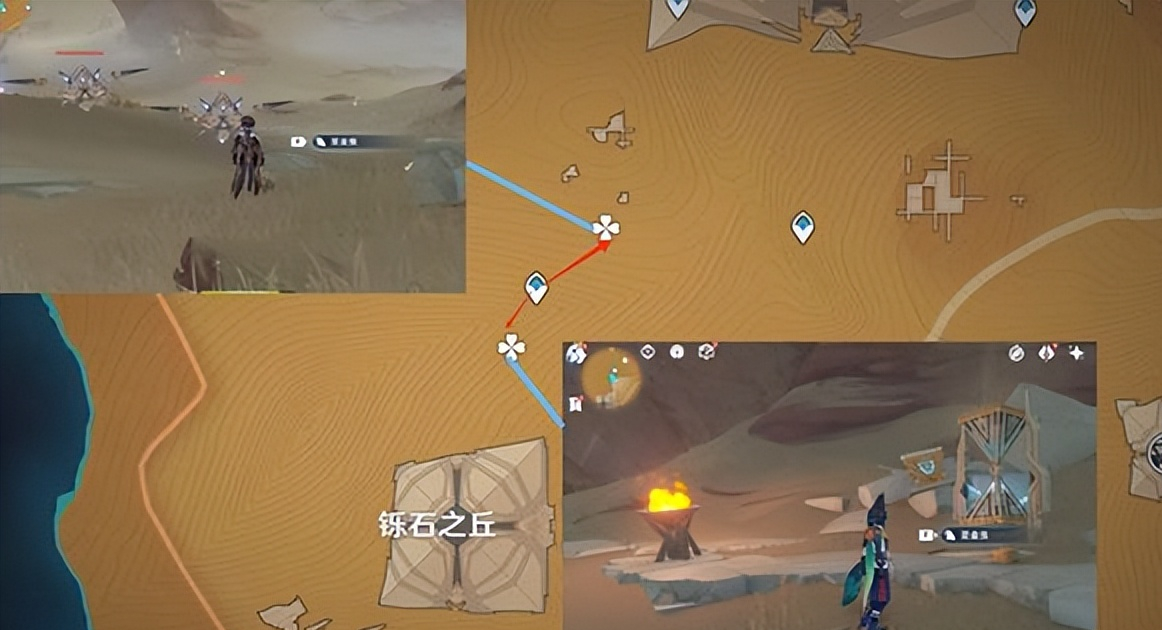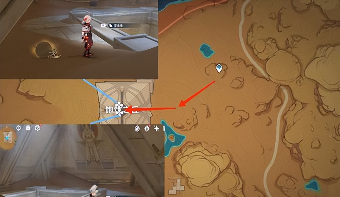 1号标记图处圣金虫在沙堆里,需要用到风元素角色,将沙堆吹走后便会出现圣金虫;