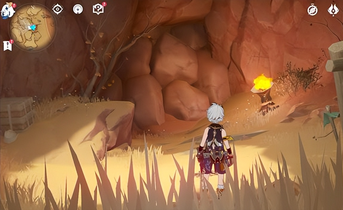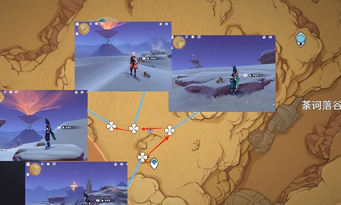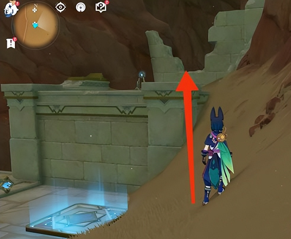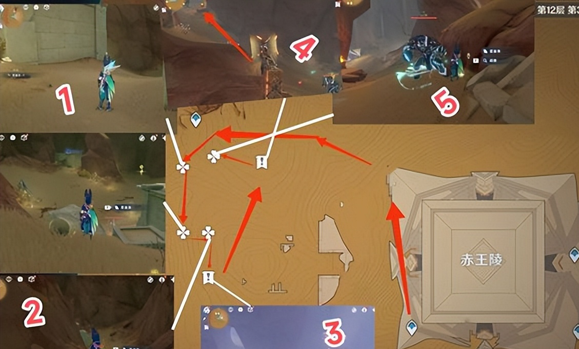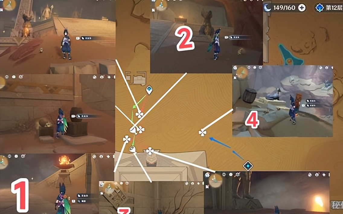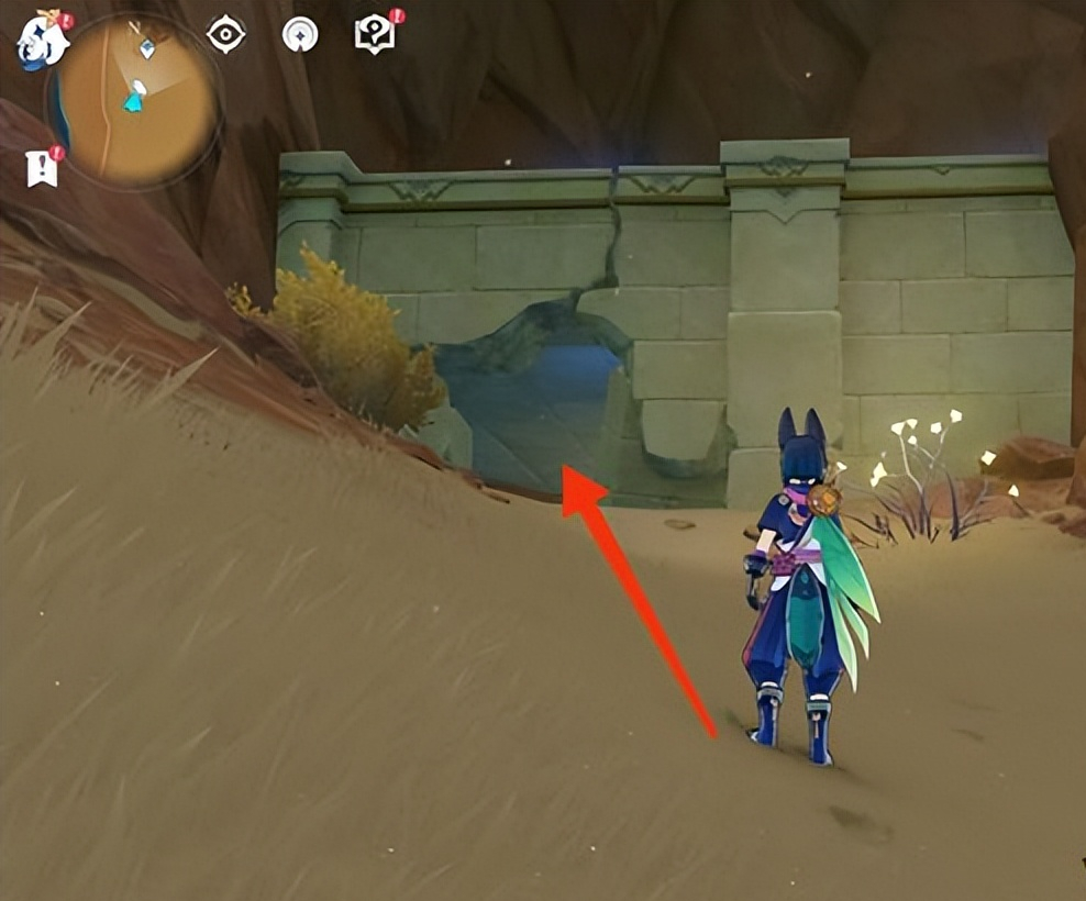 1号标记图处圣金虫在沙堆里,需要用到风元素角色,将沙堆吹走后便会出现圣金虫;