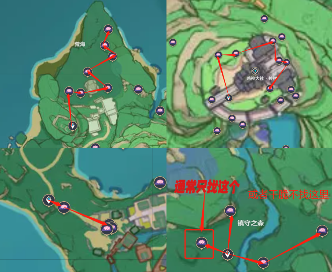 1.天云草实(雷电将军需要的材料,这个材料的位置已经很密集,带上五郎到天云峠找就可以,都在这里,很多时候懒得全找,就按箭头的位置走一圈下线,过两天或者想起来再过来走一圈)