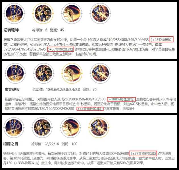 可以看到,杨戬的技能伤害加成极低,低到什么程度?夏侯惇1技能两段有200%ad加成,大招两段有236%伤害加成,而杨戬大招哪怕三段贴脸拉满,最多也只有259,但耗费的时间有多久大家都知道。