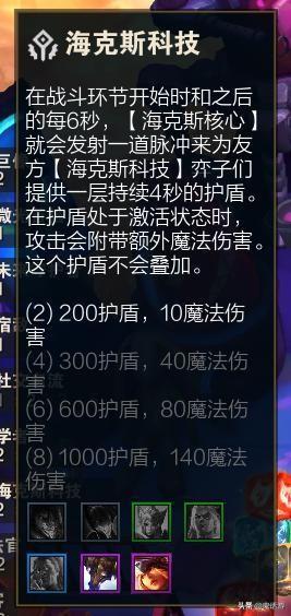 海克斯科技。在战斗开始之后,每过六秒钟的时间,所有的海克斯英雄将会获得一个护盾,这个护盾可以持续四秒钟的时间,而且在护盾存在的时候,海克斯英雄们的攻击将会造成额外的魔法伤害,也就是说在战斗的时候,海克斯英雄们会在固定的时间获得护盾以及额外的攻击伤害,输出与一个小爆发效果吧,但主要的还是一个保护效果,爆发输出的话也仅仅只是对那些攻击速度高的英雄比较有用,一般的情况下还是中规中矩的。