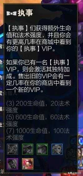 执事。执事英雄们可以户的额外的生命值加成和额外的法术强度加成,并且还会增加商店中出现VIP执事英雄的几率,在执事英雄的身份是VIP的时候,他将会获得自身独特的效果加成,每一名执事英雄所拥有的效果都是不同的,这样也就可以让我们在搭配阵容的时候需要好好的选择一下,只有在主C获得VIP加成的时候,整个阵容的输出能力才会得到巨大的提升。总体上来说,VIP的视觉感受比较类似于天选之人的效果,但是却不会影响执事英雄的星级,只会激发他们自身独特的加成效果罢了。