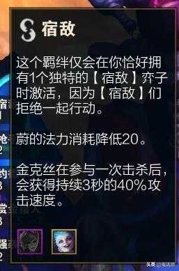 宿敌。金克斯和蔚经过s6赛季的战斗之后,她们之间的姐妹情谊产生了破碎,昔日还是作为姐妹相伴登场的,如今却是作为宿敌再次登场,蔚获得的羁绊加成效果是法力值消耗降低二十点,蔚就可以在战斗中更加频繁的释放技能了,金克斯获得的羁绊加成效果是在参与一次击杀之后,她将会获得一个可以持续三秒钟时间的攻击速度加成,可以增加她百分之四十的攻击速度,比较类似于正常模式中的被动效果,可以增加对于残局的收割能力。