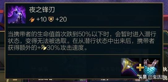 还有一件装备发生了改变,几乎是彻头彻尾的改变,那就是复活甲被替换成了夜之锋刃,其效果是在携带者的生命值首次下降到百分之五十以下之后,他就可以进入潜行状态,无法被选取并且移除所有的负面效果,而且在从潜行状态出来后,他还会获得额外的百分之三十的攻击速度加成,总体上来看,这件装备是和一个海克斯强化效果比较像的,那就是刺客的专属海克斯——烟幕弹。
